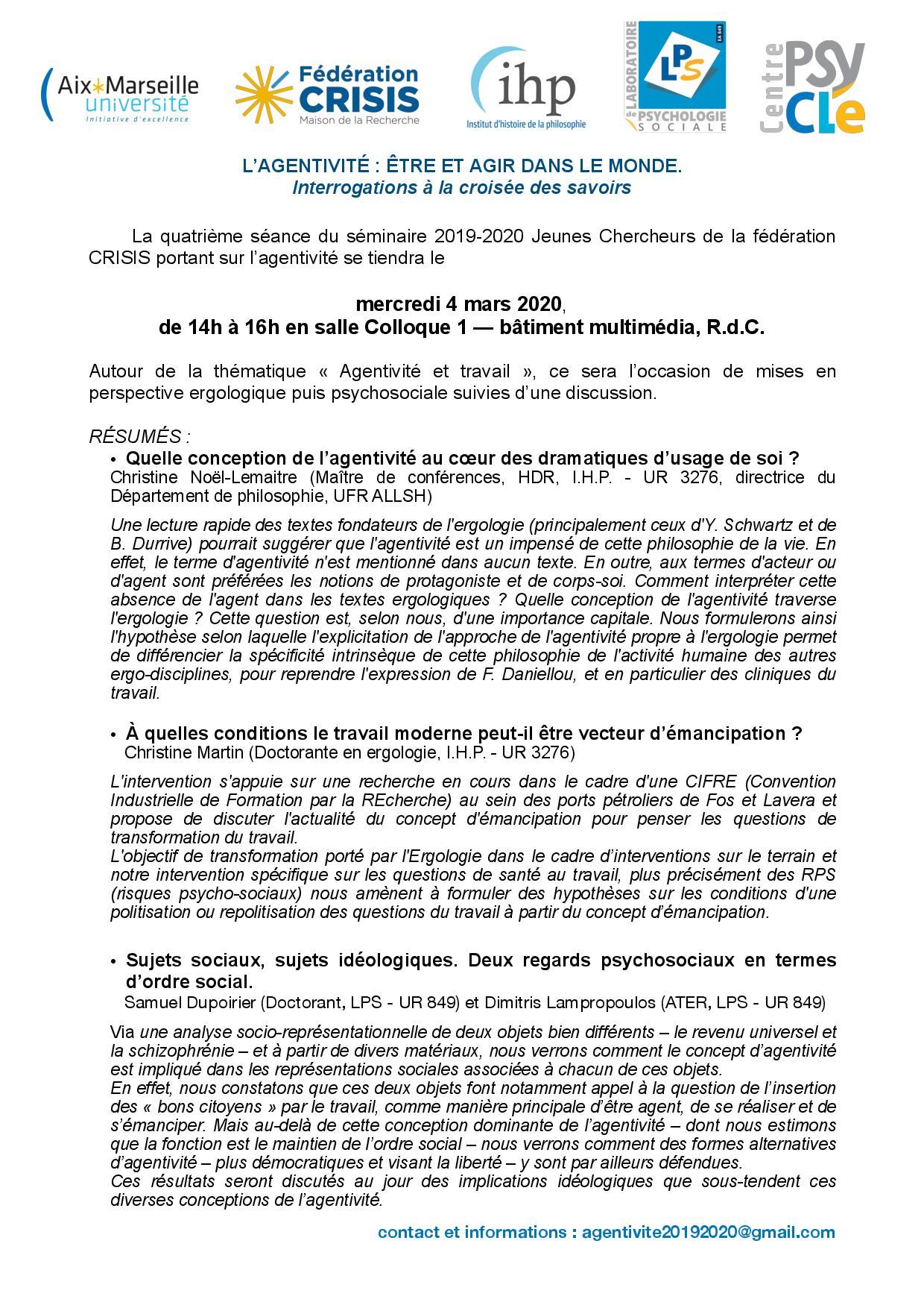 Séminaire Crisis Jeunes Chercheurs "Agentivité : Être et agir dans le monde. Interrogations à la croisée des savoirs" - Quatrième séance : Agentivité et Travail