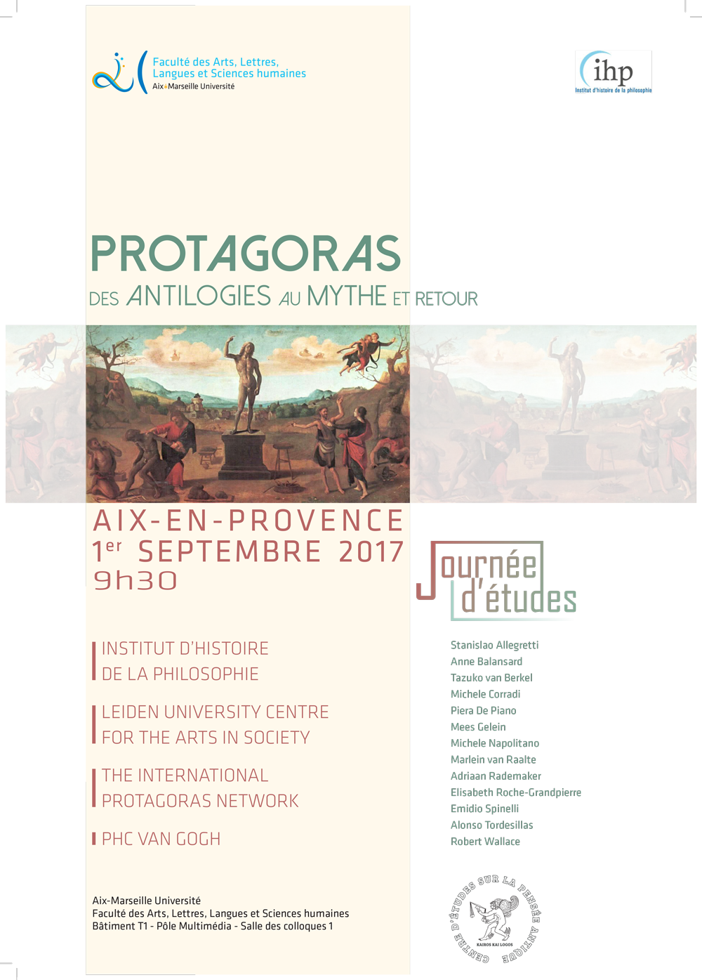 Le projet The International Protagoras Network dont sont conjointement porteurs les chercheurs de l’université de Leyde et ceux de l’université d’Aix-Marseille coordonnés par M. Van Raalte et M. Corradi se propose de mettre à la disposition de la communauté scientifique internationale une édition numérisée des sources et des témoignages de Protagoras, accompagnée d’une traduction et d’un commentaire. La journée d’études, Protagoras. Des antilogies au mythe et retour, a comme but de rendre publiques les résultats acquis et de discuter le futur du projet. Pour donner à la journée une perspective plus ample et favoriser le débat critique, on prévoit la présence de deux grands spécialistes de Protagoras externes au projet (E. Spinelli de l’Université de Rome La Sapienza et M. Napolitano de l’Université de Cassino) qui donneront deux conférences plénières. Participants : Stanislao Allegretti (AMU), Anne Balansard (AMU), Tazuko van Berkel (Leiden), Piera De Piano (AMU), Mees Gelein (Leiden), Michele Napolitano (Cassino), Marlein van Raalte (Leiden), Adriaan Rademaker (Leiden), Elisabeth Roche-Grandpierre (AMU), Emidio Spinelli (Roma Sapienza) Alonso Tordesillas (AMU), Robert Wallace (Chicago).